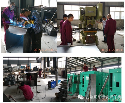 工人們正在車間內(nèi)加緊生產(chǎn)糧食烘干機,現(xiàn)場機器轟鳴,焊花飛濺。